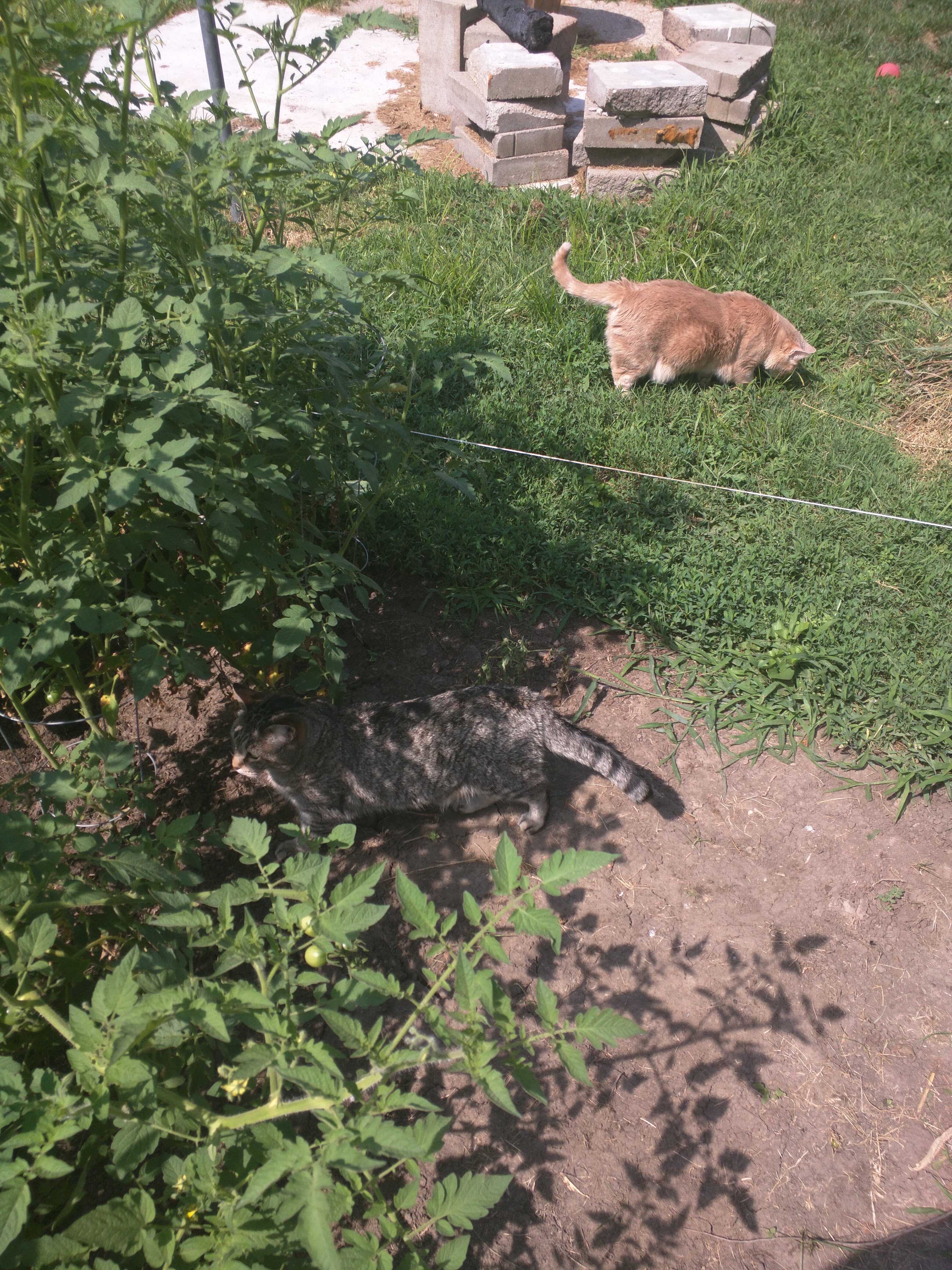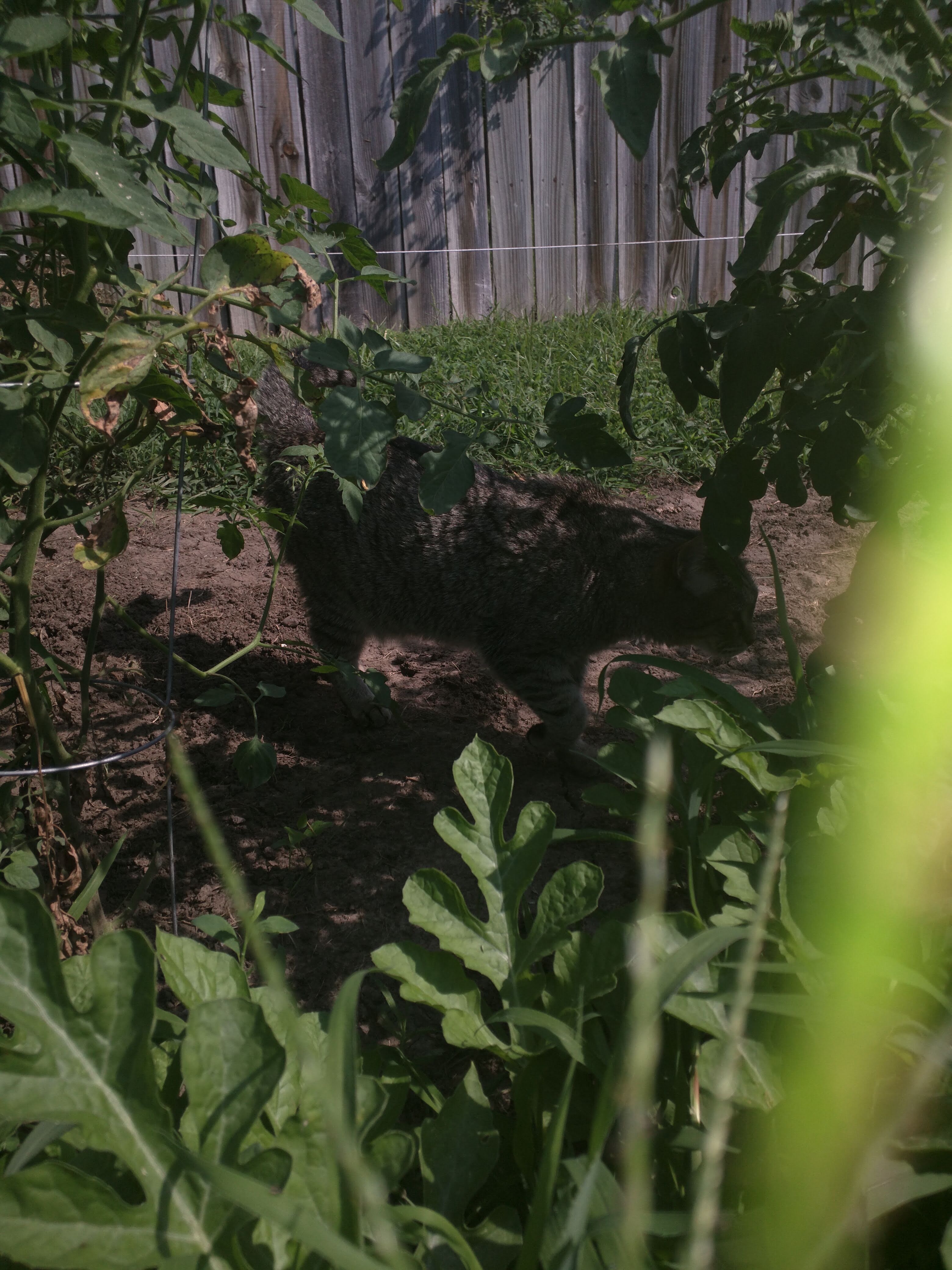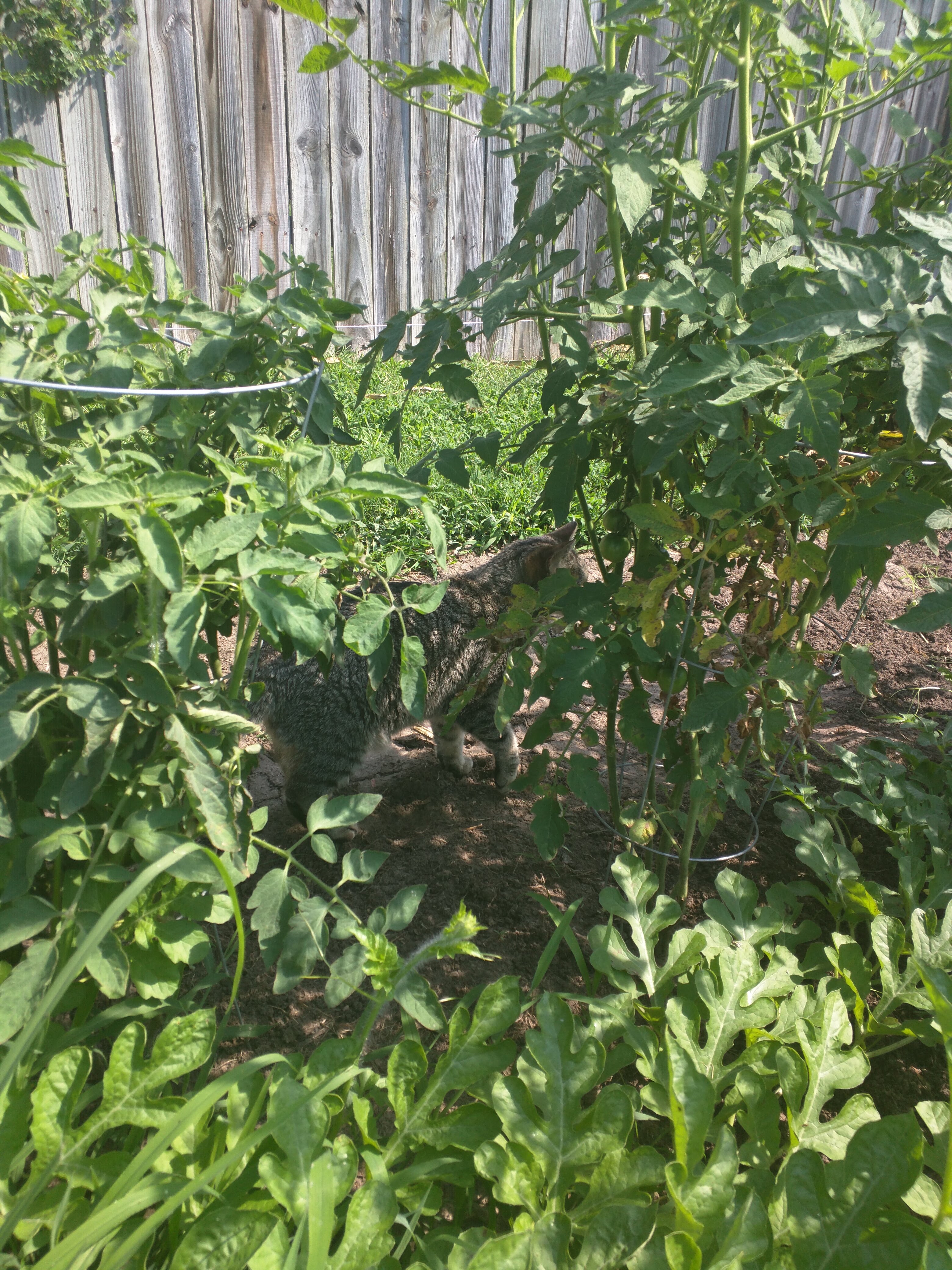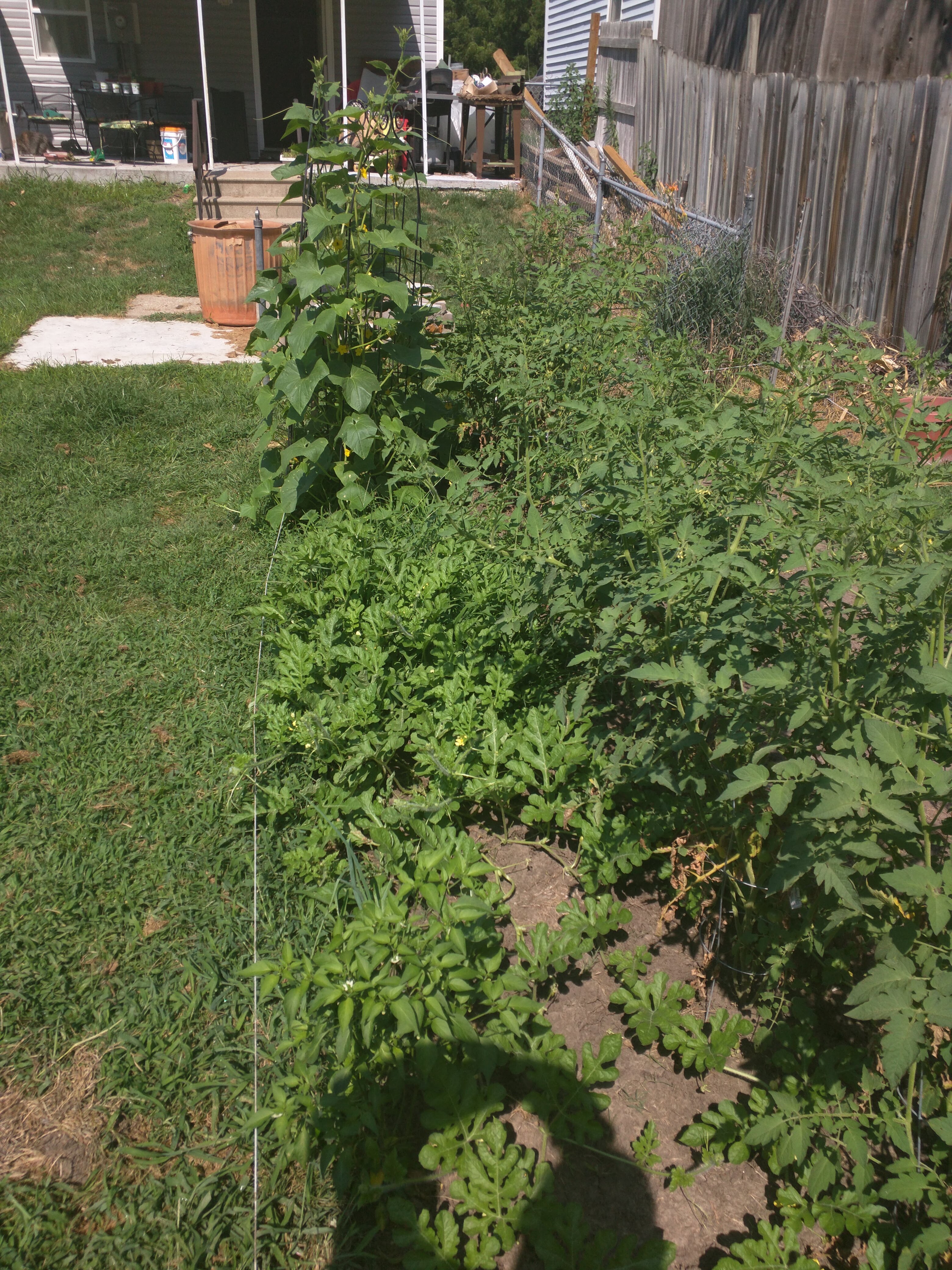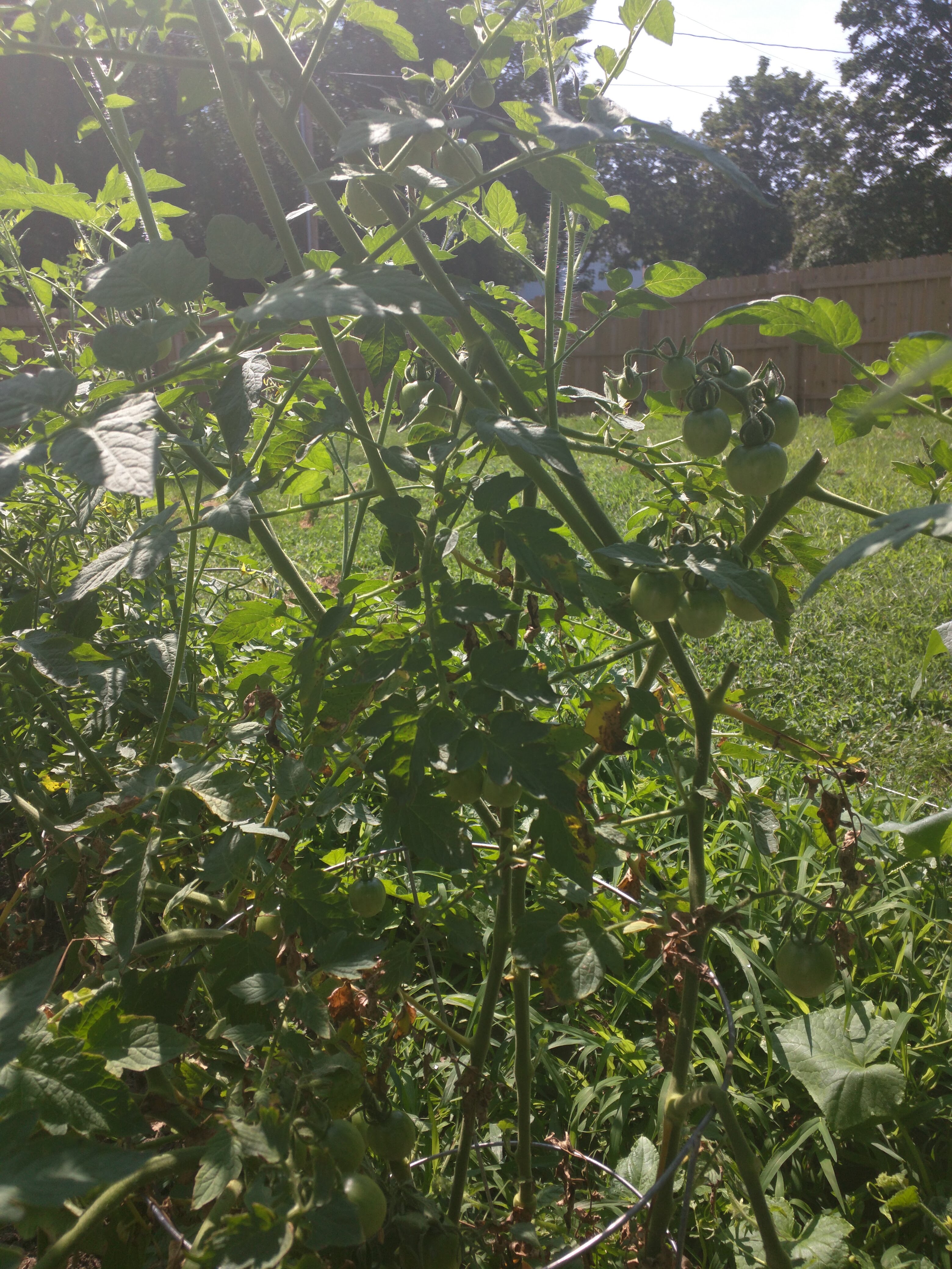 So not much happened in the last few days with the garden in general besides us planting some need seeds in some containers. We ended up getting a few more “cherry tomatoes” off the mama plant (remember we cloned this one a few times) which are sitting on the kitchen counter to clear up them tiny yellow/orange spots. While watering this morning i found out the mama can’t handle her own weight anymore and crushed itself. I will be looking into getting this to stand back up hopefully tomorrow with some of the wire fencing bob has over at our house as it seems more rigid and a lot stronger then the cages. We have been taking cucumbers from the plants as they finish up and plan to make some more pickles in the coming week.