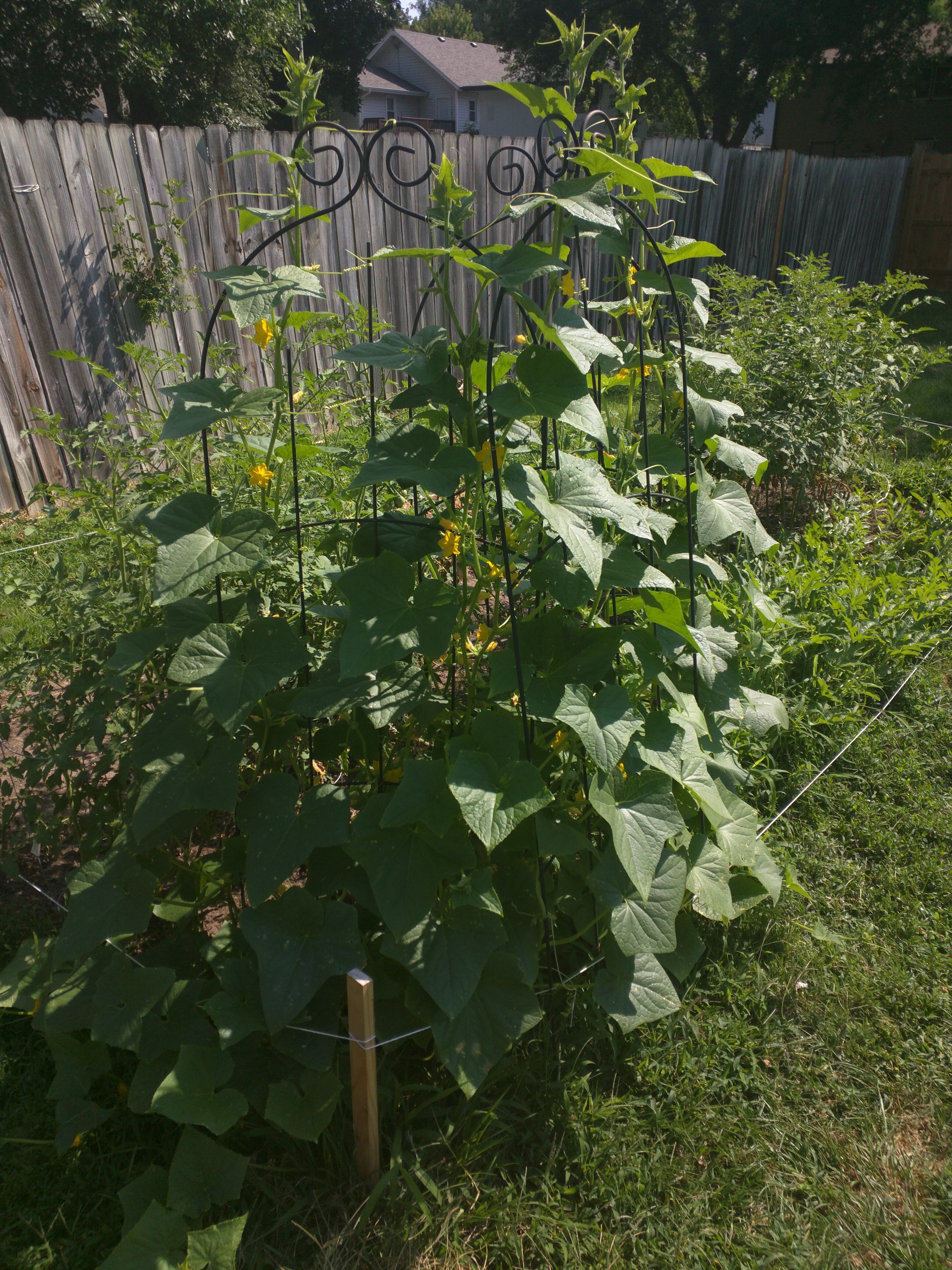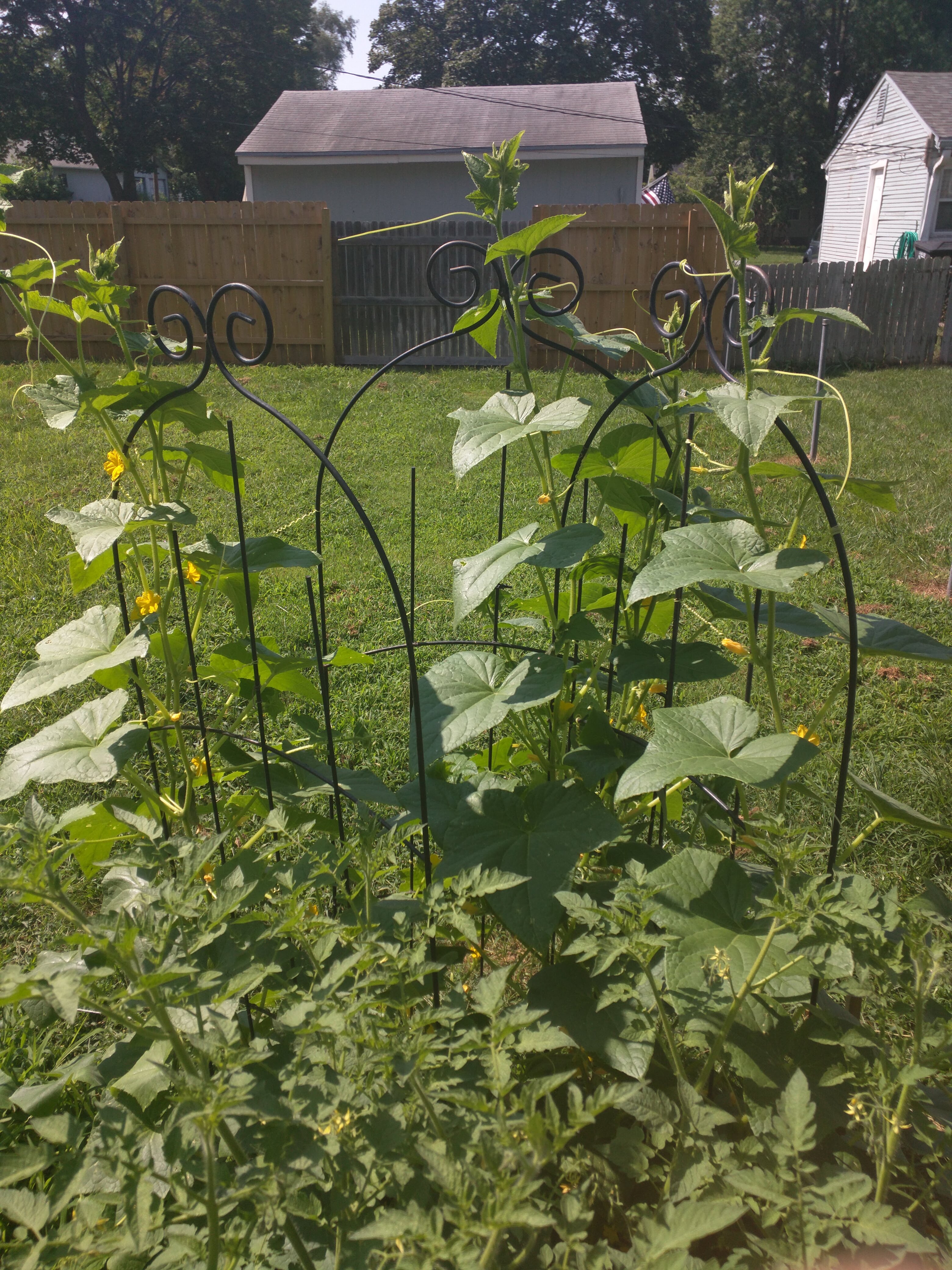 - Cucumber on its trellis growing up nice and tall, all three trellis are bound together from the tendrils from the cucumbers now!