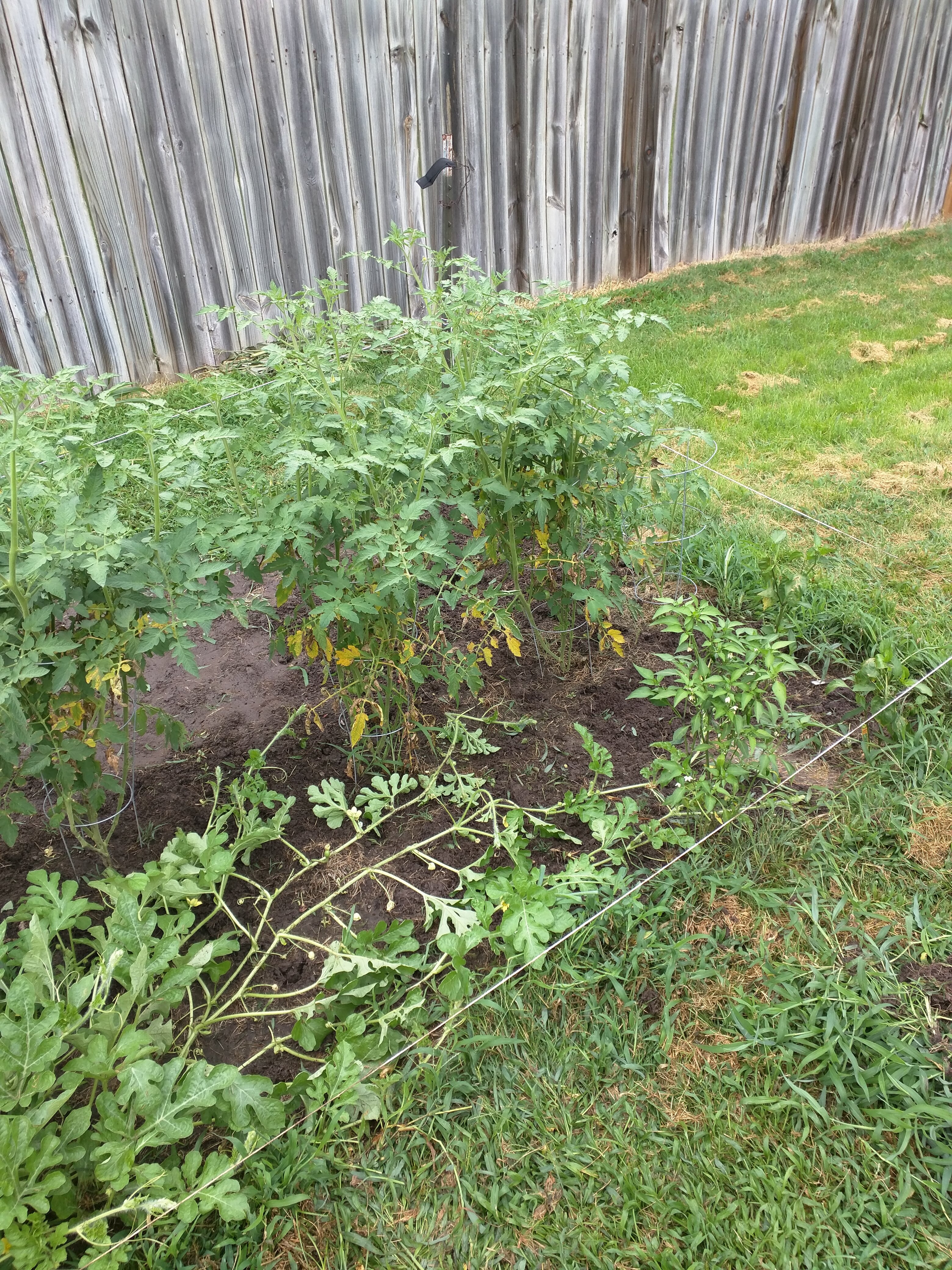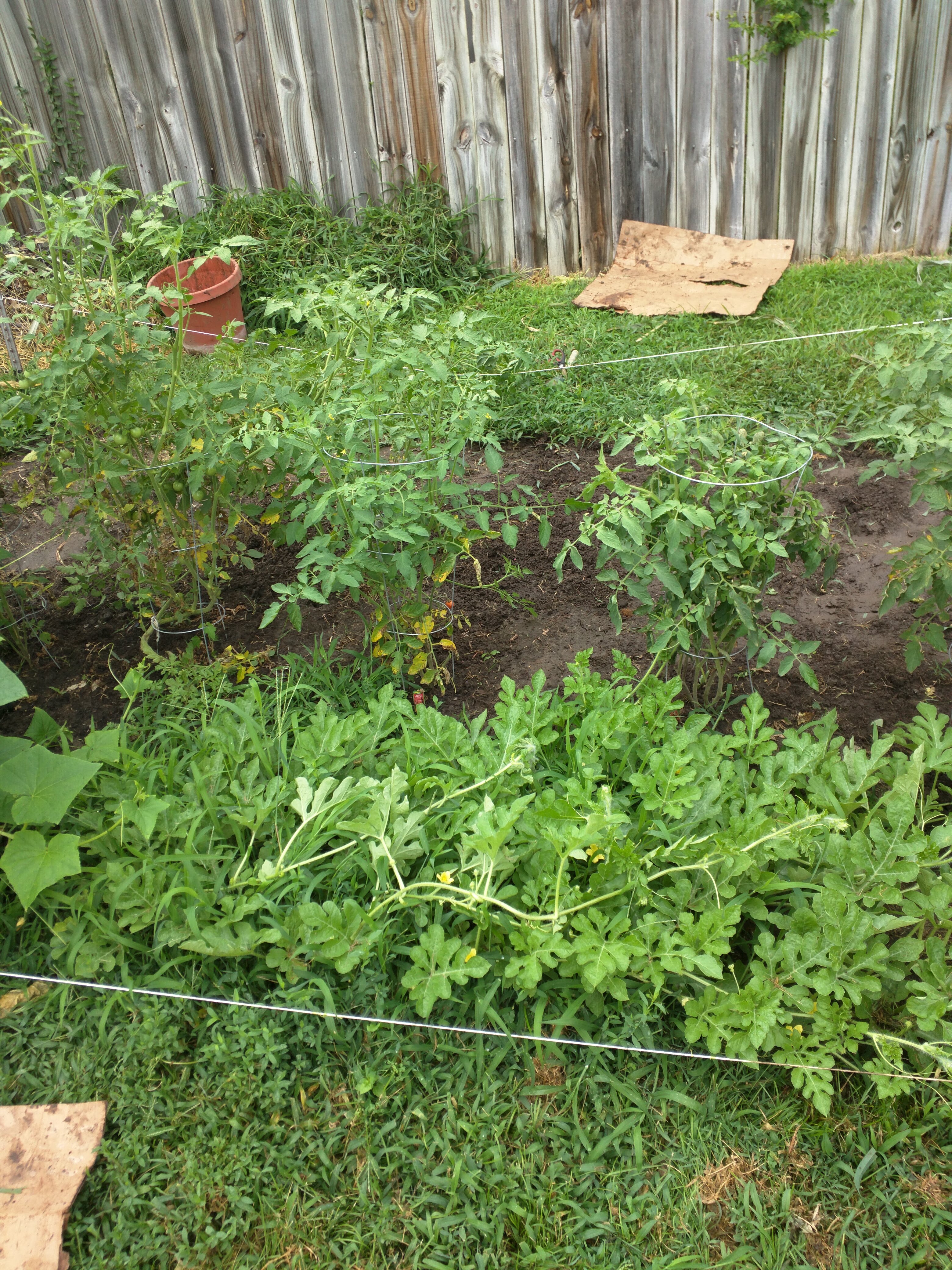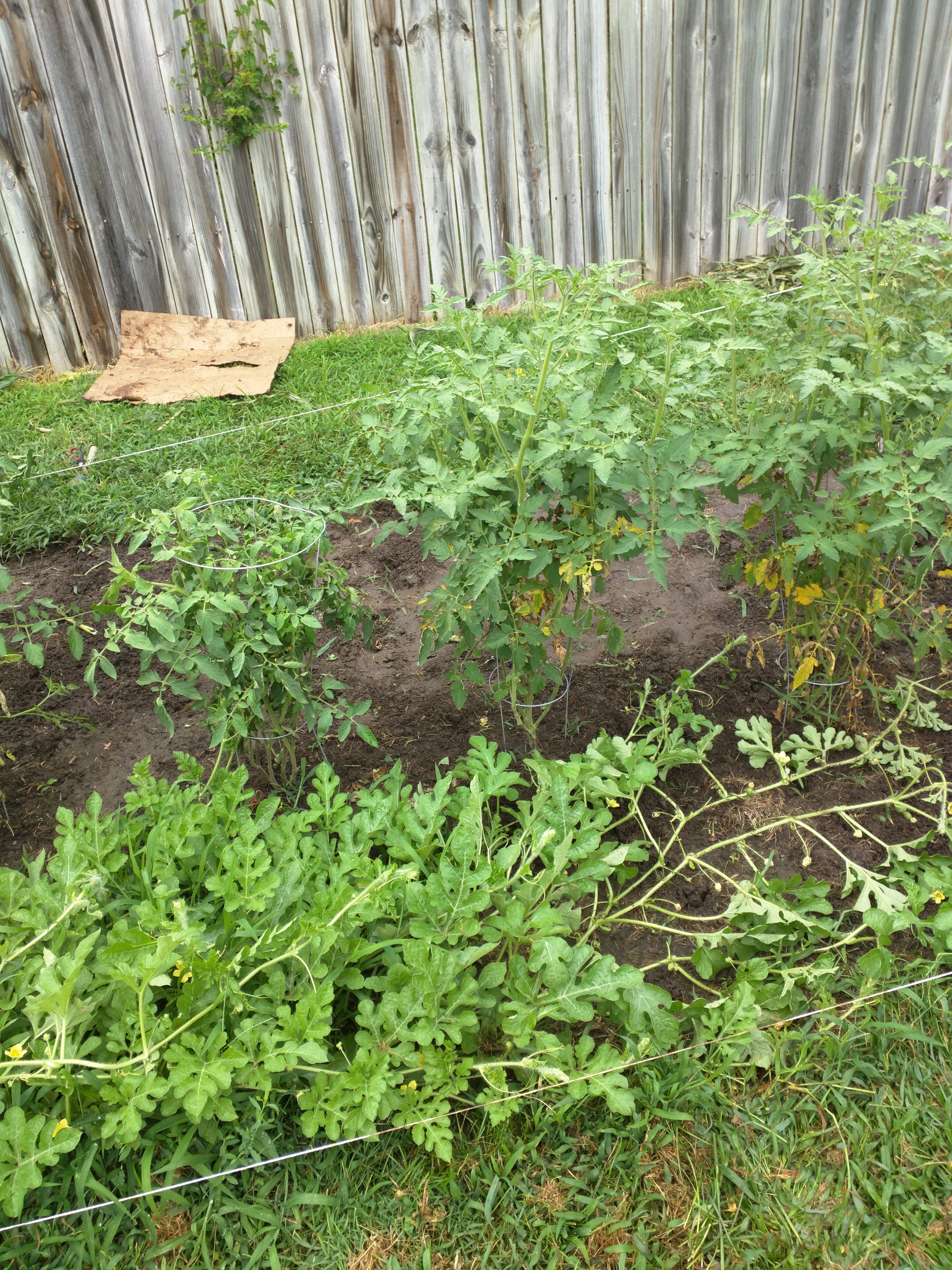 - You can see the watermelon vines and the cleaned out tomatoes are deweeded