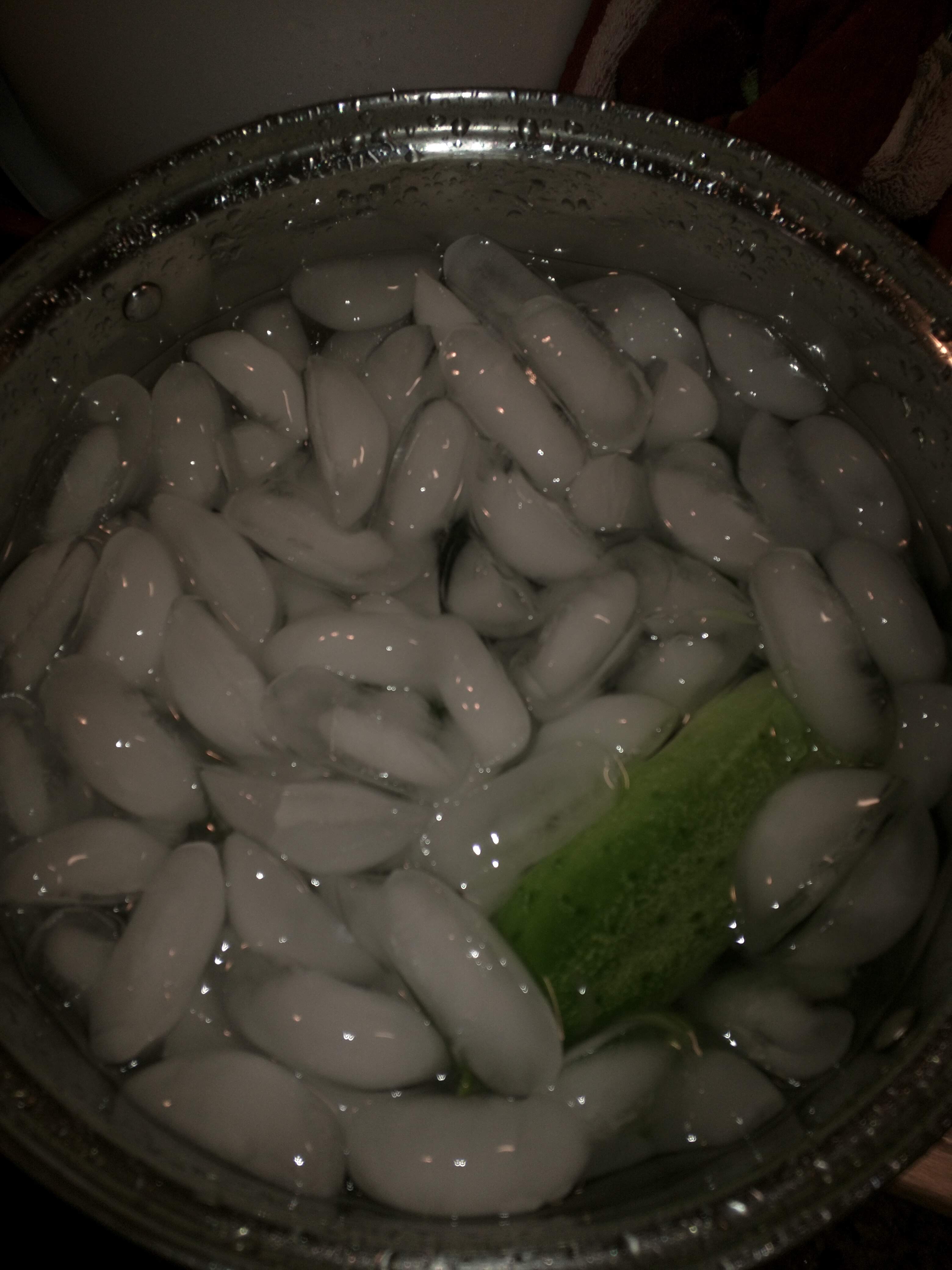 - Cucumbers in the ice bath for round two. Pushing for a lot less salt this time around!